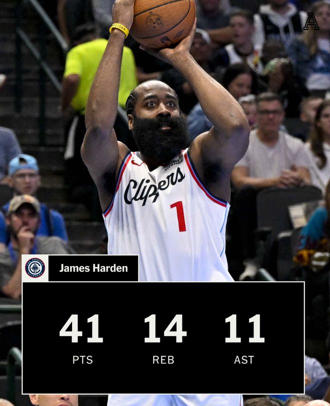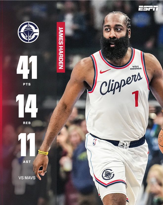 对阵独行侠一战哈登打了足足51分钟,两个加时赛的10分钟是一分钟没休息,全场比赛25中13,三分12中6,罚球11中9,拿到41分14篮板11助攻的超级三双数据,他终于帮助LAC结束了六连败。