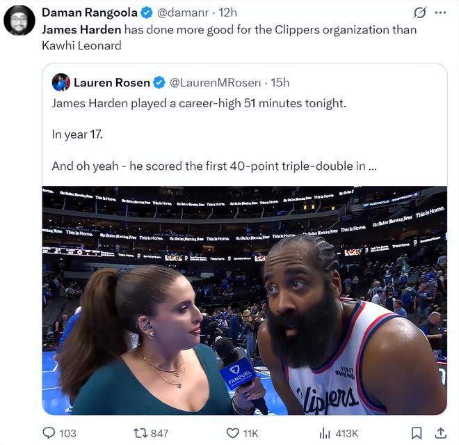 生涯第17个赛季打了常规赛新高的51分钟还拿到40+三双,快船记者都在感谢哈登的付出。美记Daman Rangoola写道:哈登为快船做出的贡献已经超过了科怀-伦纳德。